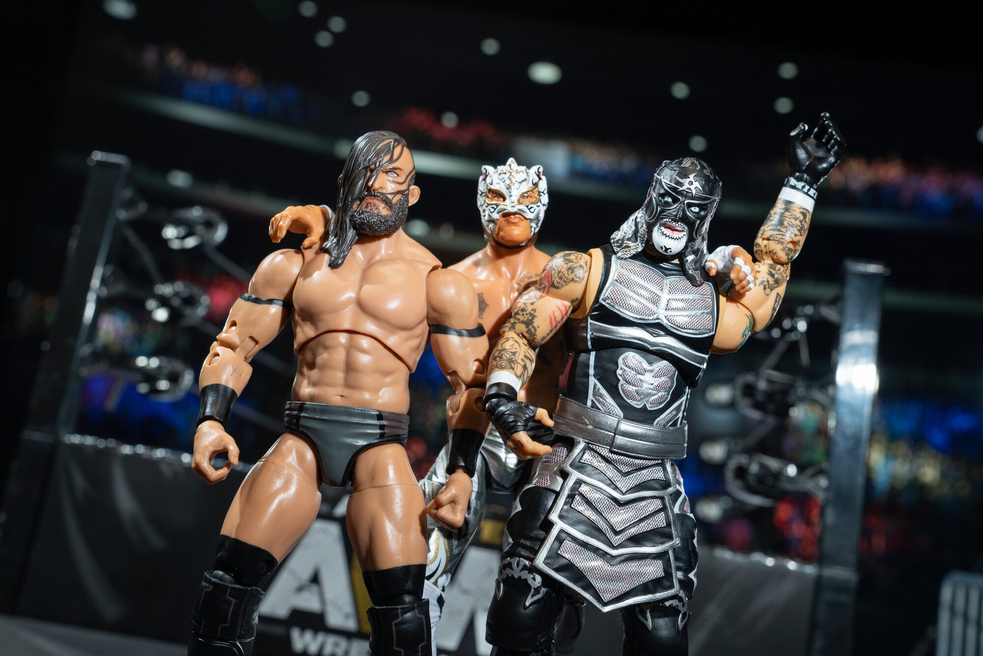 Form a triple threat with the Death Triangle Vault Exclusive. This deluxe three figure set features the AEW World Trios Champions PAC, Rey Fenix, and Penta El Zero Miedo. Each highly poseable 6-inch action figure includes 25 points of articulation and is inspired by Death Triangle’s first championship victory on AEW Dynamite 9/7/2022. They all enter the ring with their World Trios Champion Belts and come equipped with a pair of alternate hands. AEW Vault Exclusive figures are highly posable and use advanced scanning technology to capture realistic details from each wrestler. Officially licensed AEW product by Jazwares. Ages 8+