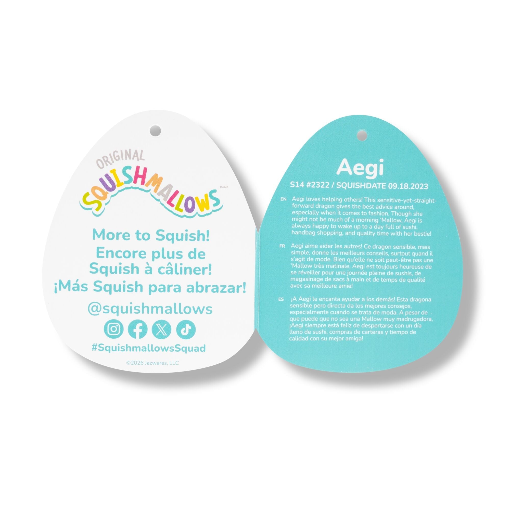 Meet your new bestie, Aegi! Each Squishmallow plush comes with its own unique name and bio and makes the perfect cuddly companion for long flights out or comfy nights in. Aegi is only by Original Squishmallows. Join the Squad today!